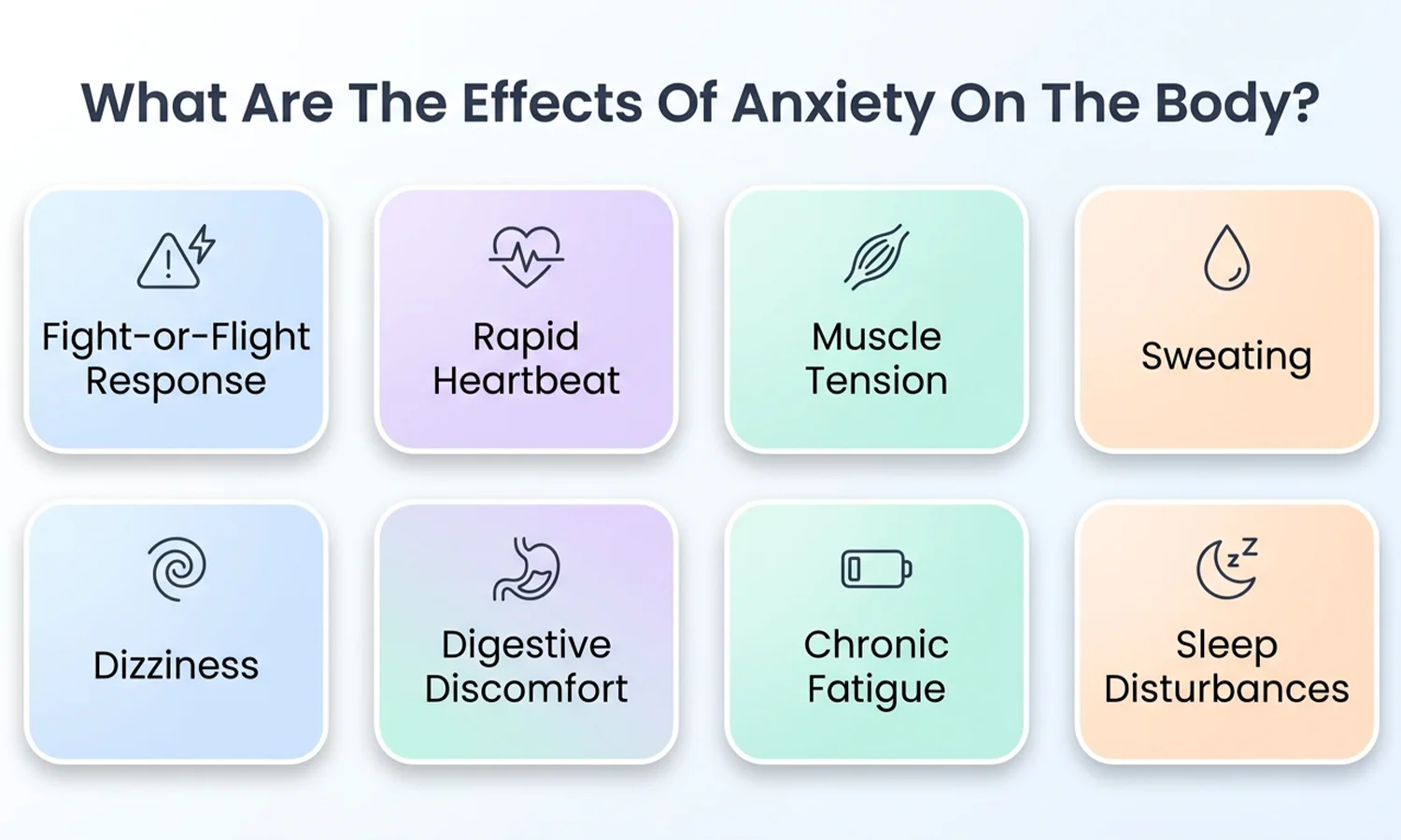 Physically, anxiety may appear as a racing heartbeat, sweating, fatigue, or digestive discomfort. Some people also experience restlessness or difficulty sleeping. Mentally, it often shows up as constant worry, difficulty concentrating, or a sense that something is about to go wrong.