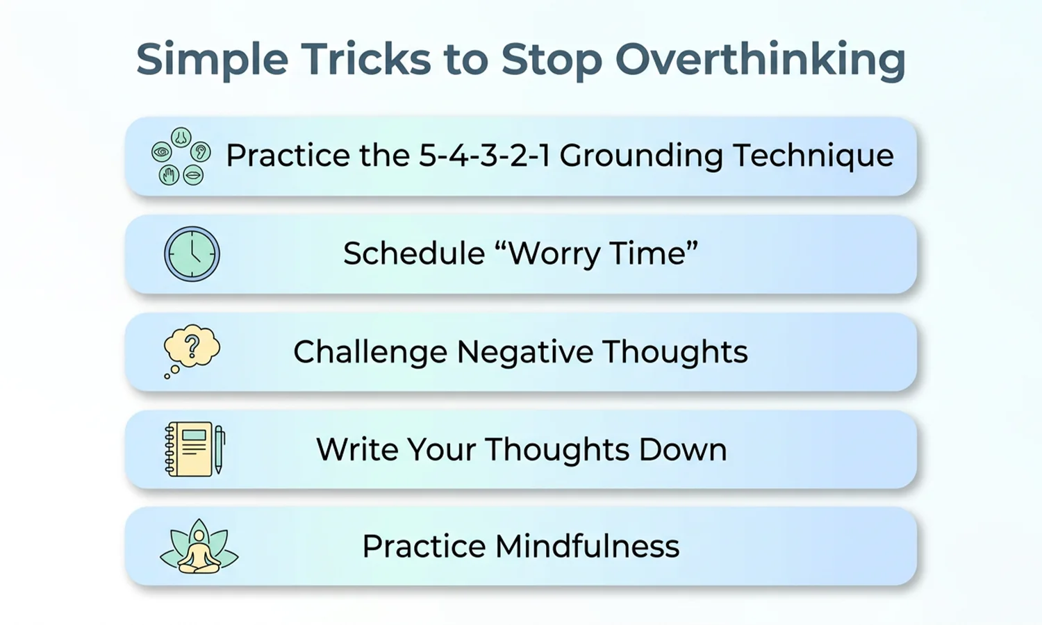Over time, practicing these strategies helps individuals respond to stressful thoughts more calmly and prevents overthinking from controlling daily life.