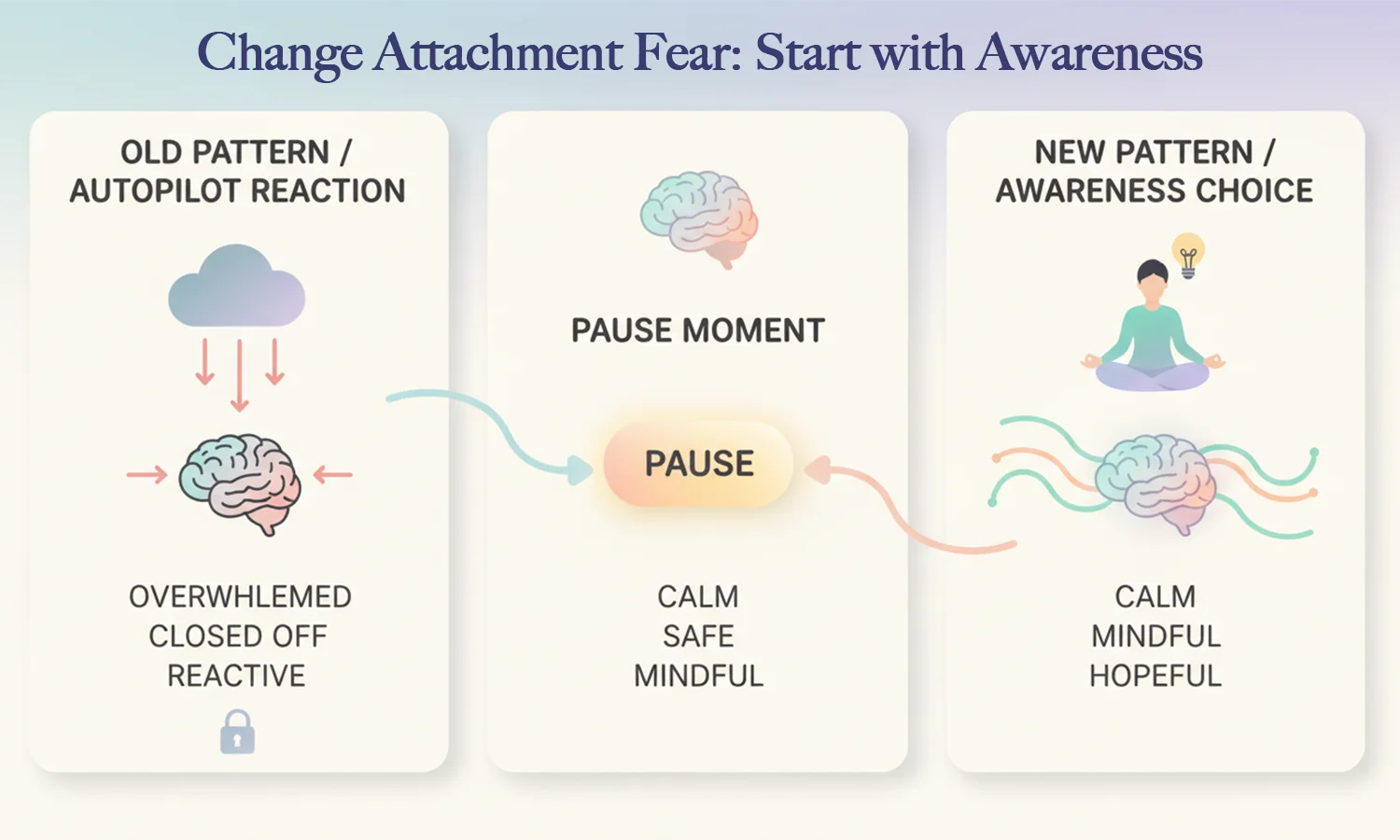 The fastest shift in the fear of attachment begins with awareness. Most attachment patterns operate on autopilot. The brain reacts before you consciously understand what is happening.